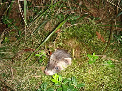 Jeśli ktoś myśli, że fretka puszczona wolno zawsze ucieknie i tylko opadający kurz po niej zostanie to pokazujemy fragment naszego spaceru. Uwaga: Nie naśladować ! No chyba, że dobrze znacie swoje zwierzęta oraz teren. Inaczej pozostaje smycz i plątanie się na smyczy w krzakach